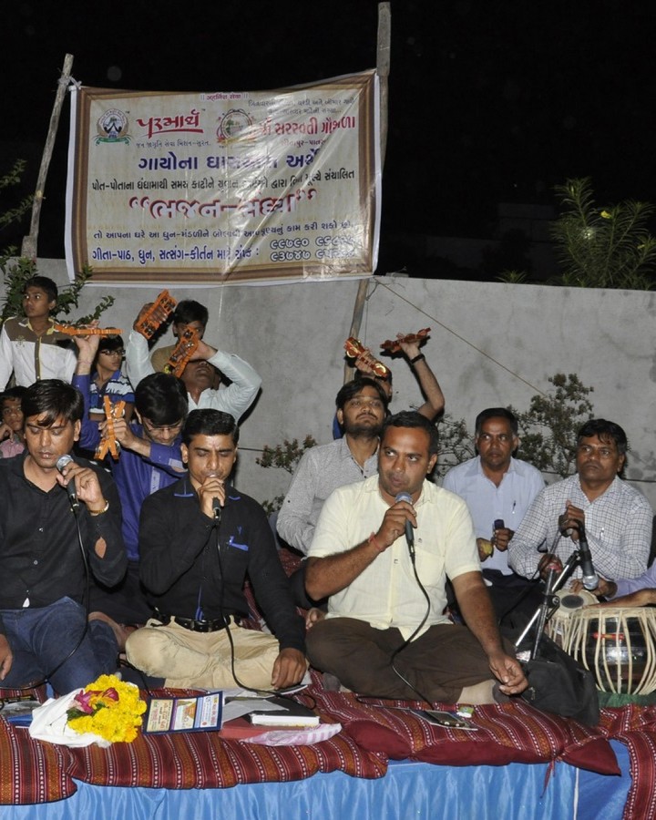 In order to make the youth independent and service- oriented, and to keep cow service as a medium in the eternal traditions, young people in cities and villages take time out of their business and sing dhuns at night free of cost. The money received from this is used for cow service, water troughs for birds, sparrow garlands, and funeral chariots.